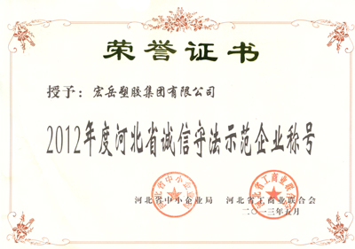 “2012年度河北省诚信守法示范企业”是由河北省中小企业局与河北省工商业联合会根据河北省人民政府《关于进一步加快民营经济发展的意见》经过严格审查后评选认定。省中小企业局、省工商联对当选示范企业进行通报表彰,并通过新闻媒体和信息网络向社会进行广泛宣传,引导我省企业增强信用意识,加强信用管理,遵守法律法规,弘扬守法经营风气,树立良好企业形象,提高企业整体素质和综合竞争力。