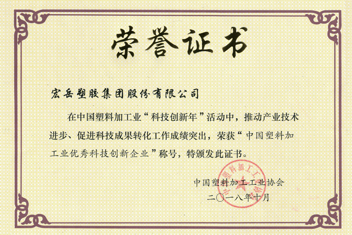 近日在中国塑料加工业“科技创新年”活动中,华体会(中国)hth集团在推动产业技术进步、促进科技成果转化工作成绩突出,荣获“中国塑料加工业优秀科技创新企业”称号,彰显了华体会(中国)hth加强科技创新和技术进步的信心和决心!