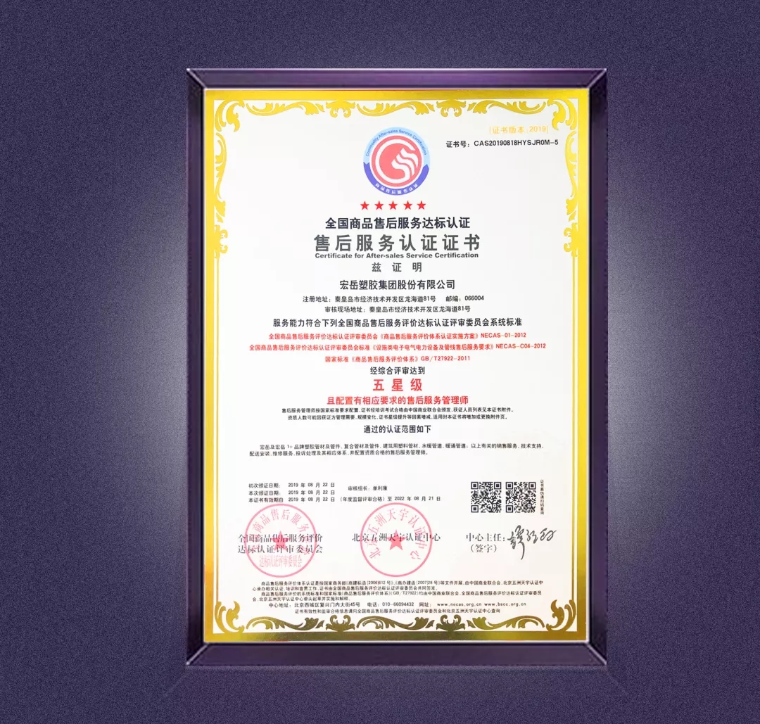 8月22日,华体会(中国)hth塑胶集团股份有限公司通过全国商品售后服务达标认证,获得五星级售后服务认证证书。