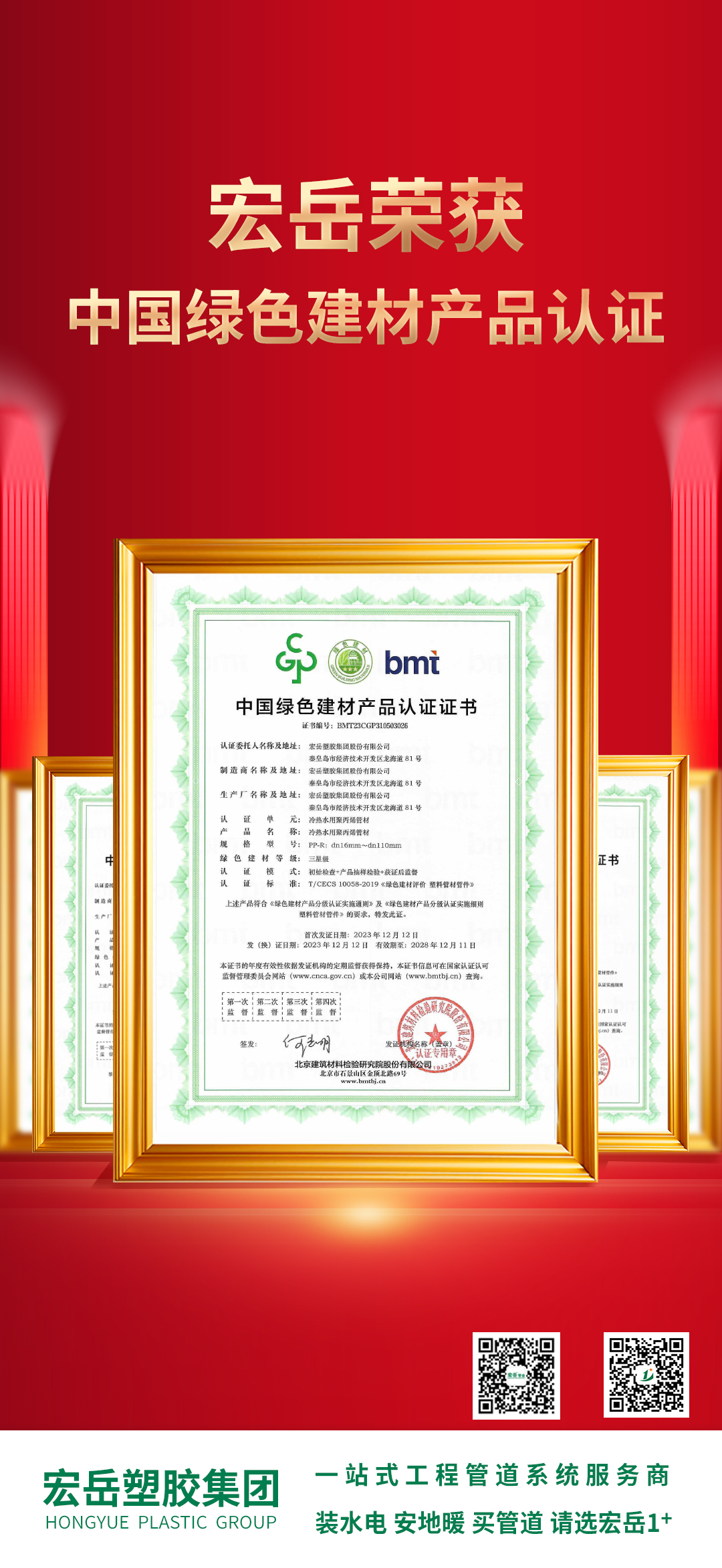 华体会(中国)hth获得中国绿色建材产品认证,本次认证对PPR、PVC、PE、PE-Xa、PE-RT管材管件等11个单元的系列产品,以环保、节能、节水、循环、低碳等评价维度进行了相关审核,华体会(中国)hth集团顺利通过。